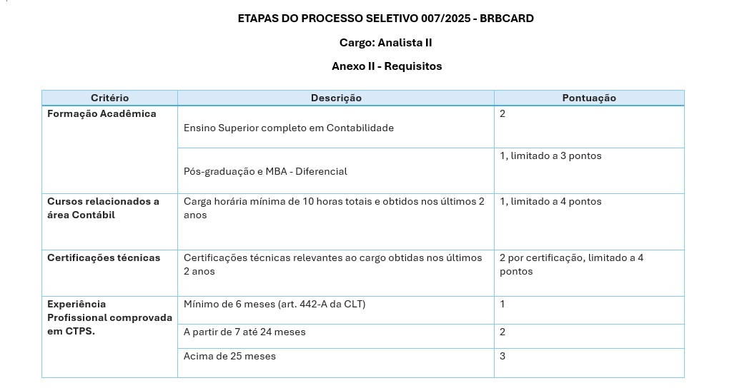 - A realização do processo e aprovação não implica em obrigação de contratação por parte da BRBCARD, que realizará o preenchimento das vagas conforme sua disponibilidade orçamentária e interesse.