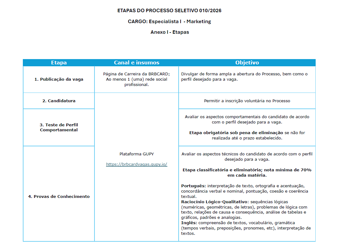 - A BRBCARD, empresa de meios eletrônicos de pagamento, torna público o presente documento para a contratação de 01 (um) profissional para o cargo de Especialista I - Marketing, conforme as condições a seguir: