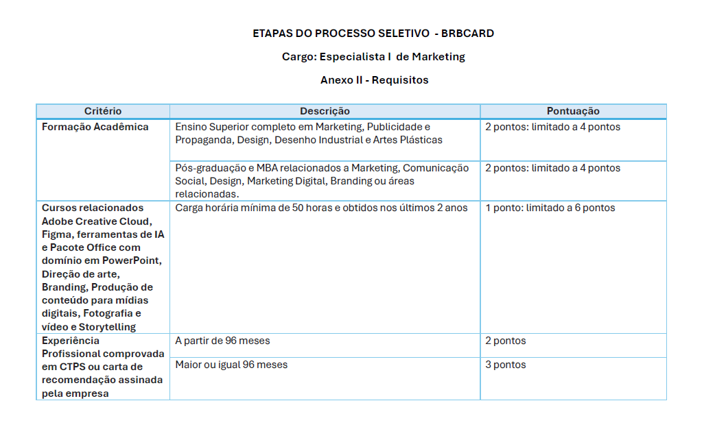 - A realização do processo e aprovação não implica em obrigação de contratação por parte da BRBCARD, que realizará o preenchimento das vagas conforme sua disponibilidade orçamentária e interesse.
