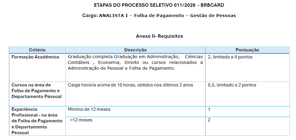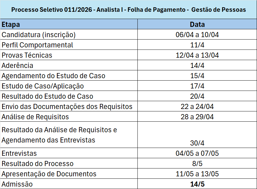 PS 011/2026 - Analista I - Folha de Pagamento - Gestão de Pessoas