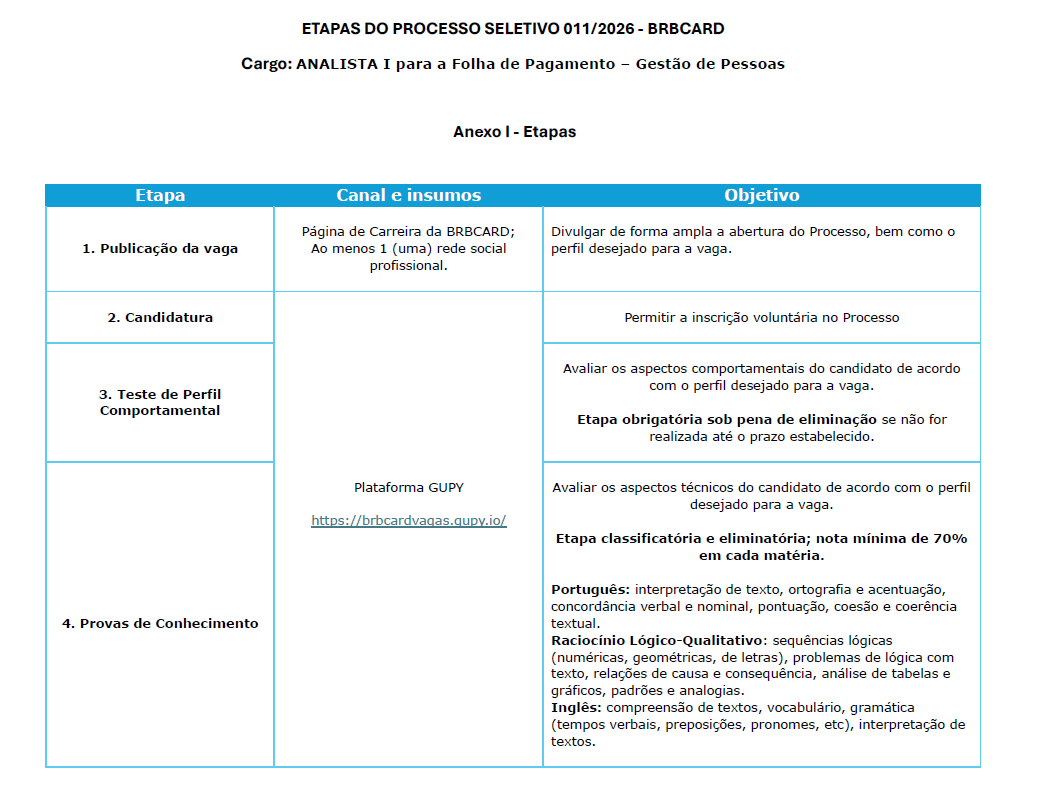 A BRBCARD, empresa de meios eletrônicos de pagamento, torna público o presente documento para a contratação de 01 (um) profissional para o cargo de Analista I conforme as condições a seguir: